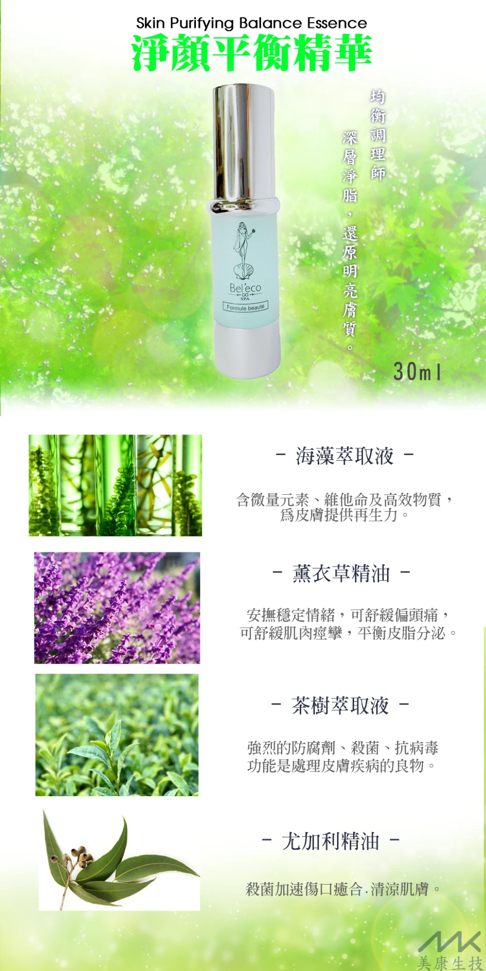 含多種有效成分,具殺菌加速傷口癒合、清涼肌膚,淨化效果絕佳。並幫助預防皮脂腺過度活躍所引起的後遺症,並透過新皮膚組織的行程而加速痊癒過程。做預防性使用時可改善皮脂腺的過度分泌,預防面皰行程及毛孔粗大,使粉刺乾燥、逐漸自行脫落。