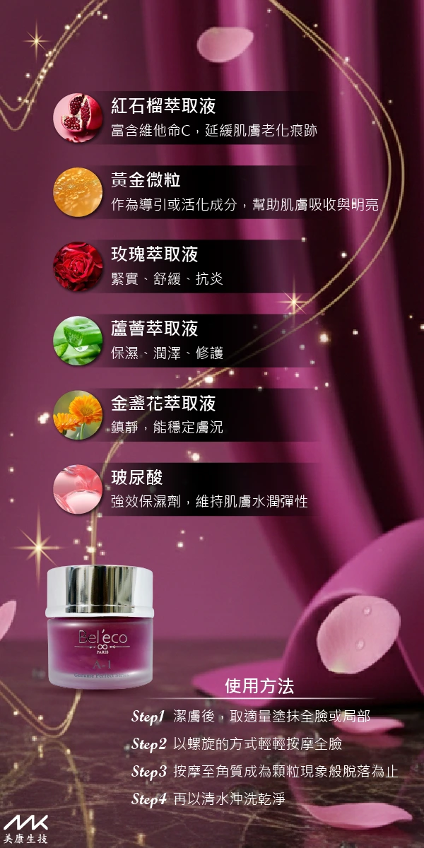 紅石榴的抗氧化能力是柑橘、櫻桃、綠茶的3倍以上,維他命C的20倍。有助於徹底改變老化的痕跡,促使皮膚表皮適當的增厚,同時保持健康的皮膚代謝速度,還可以維持彈性蛋白(elastin)及膠原蛋白(collagen)的彈力結構。富含植物萃取與黃金微粒精華,質地溫和可軟化角質,幫助代謝老舊角質及潔淨毛孔不潔物,增加肌膚健康防護力與保水力,強化肌膚彈性,令膚質更為明亮水潤。