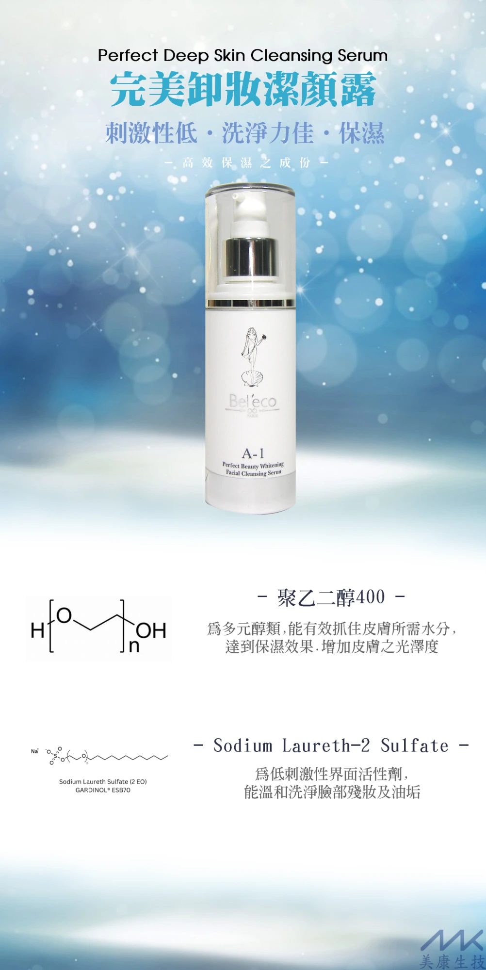 以 Cocamidopropyl Betaine 兩性型界面活性劑為主,具有良好之起泡性,低刺激性,洗淨力佳,搭配其他高效保濕之成分,在完全去除皮膚表面之汙垢、殘妝之後,能使皮膚仍維持溫和不緊繃的舒適感。卸妝、洗臉一次完成。