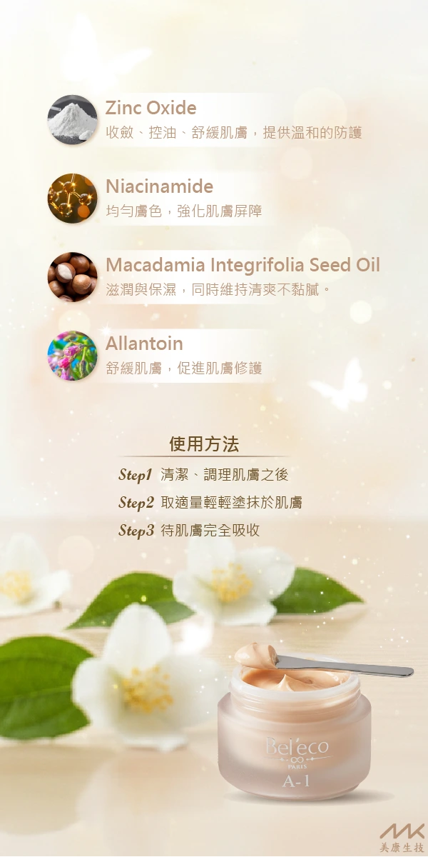 全成分:Water、Zinc Oxide、Cetyl Alcohol、Glyceryl Stearate、PEG-75 Stearate、Ceteth-20、Steareth-20、1,3-Butylene Glycol、Ethylhexyl Palmitate、Cetearyl Ethylhexanoate、Propylene Glycol、Glyceryl Stearate SE、Cetearyl Alcohol、Macadamia Integrifolia Seed Oil、GLYCERIN、Phenoxyethanol、Methylparaben、Chlorphenesin、Propylparaben、Niacinamide、Fragrance、Iron Oxide Yellow、Acrylates/dimethicone copolymer、Allantoin、DISODIUM